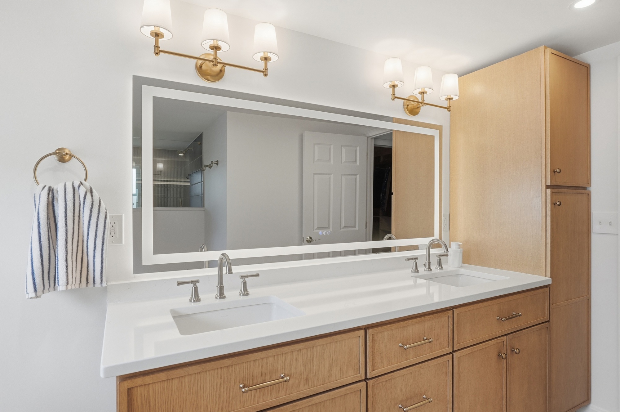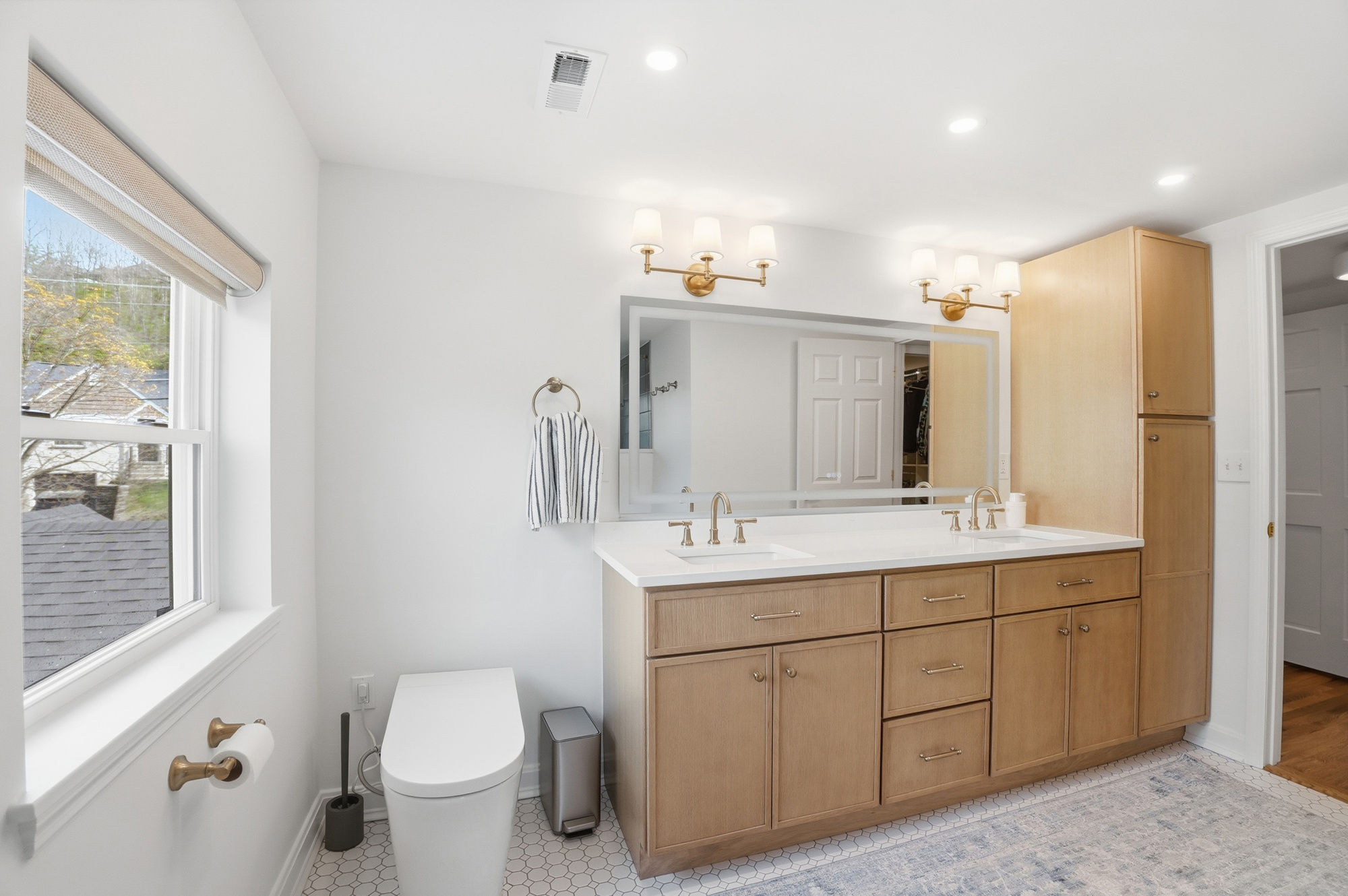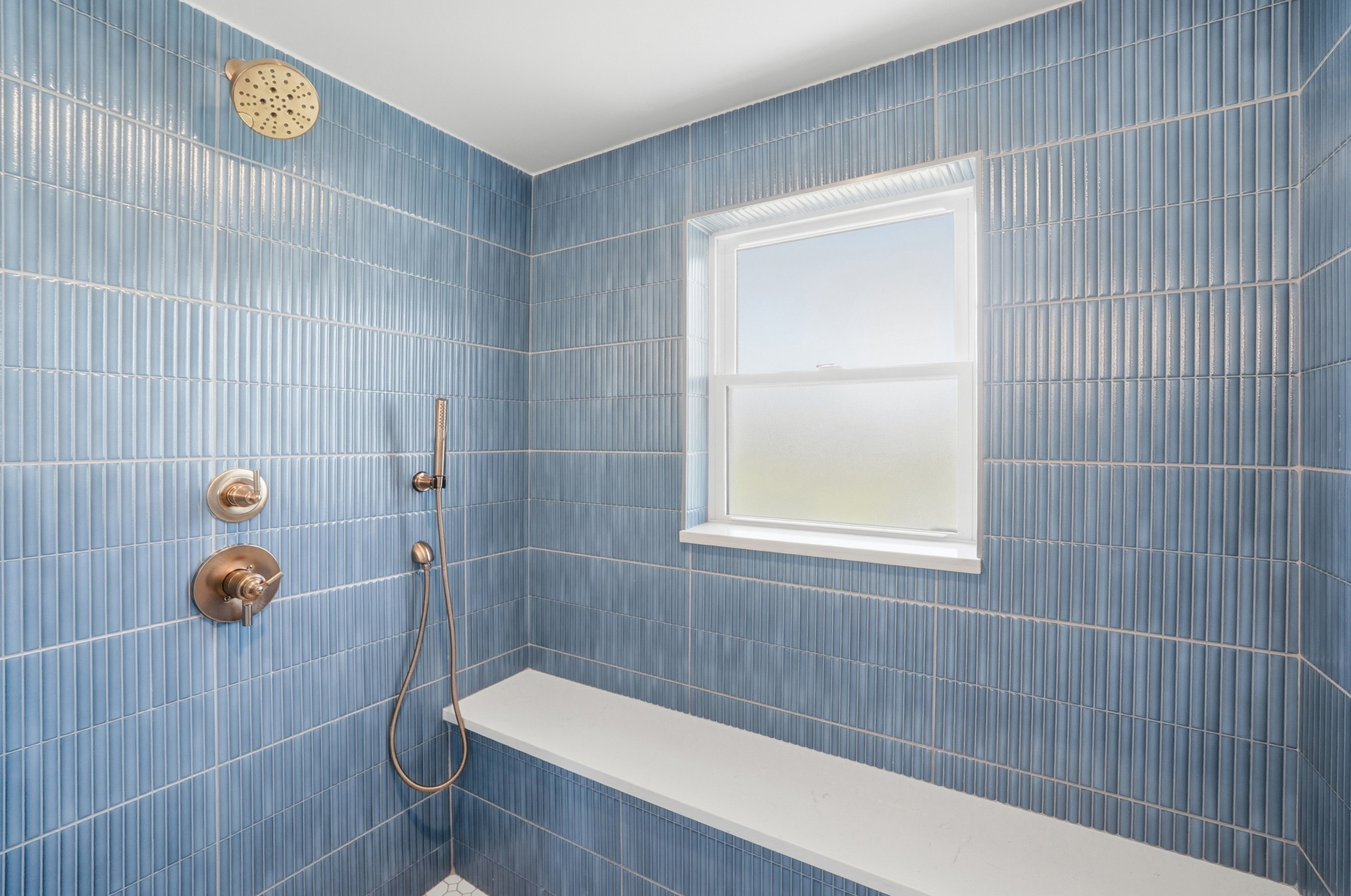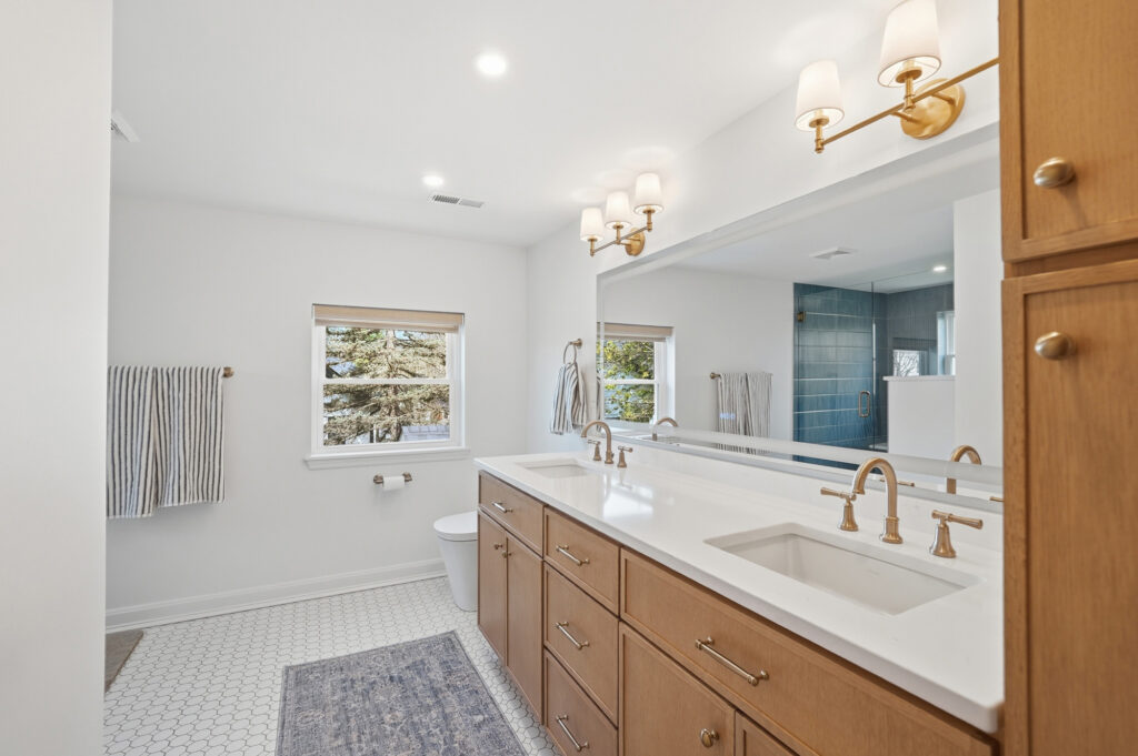 This bathroom renovation in West Chester Township blends modern design with thoughtful, personal details. Gold accents paired with classic black-and-white tile create a space that feels clean, timeless, and full of personality, proving that even small updates can make a big impact.
