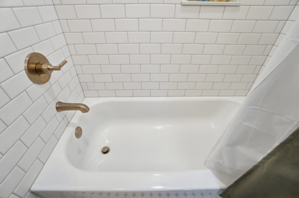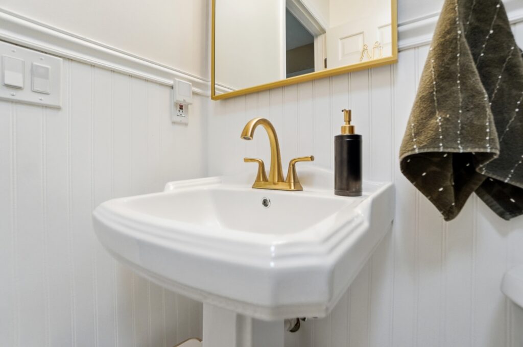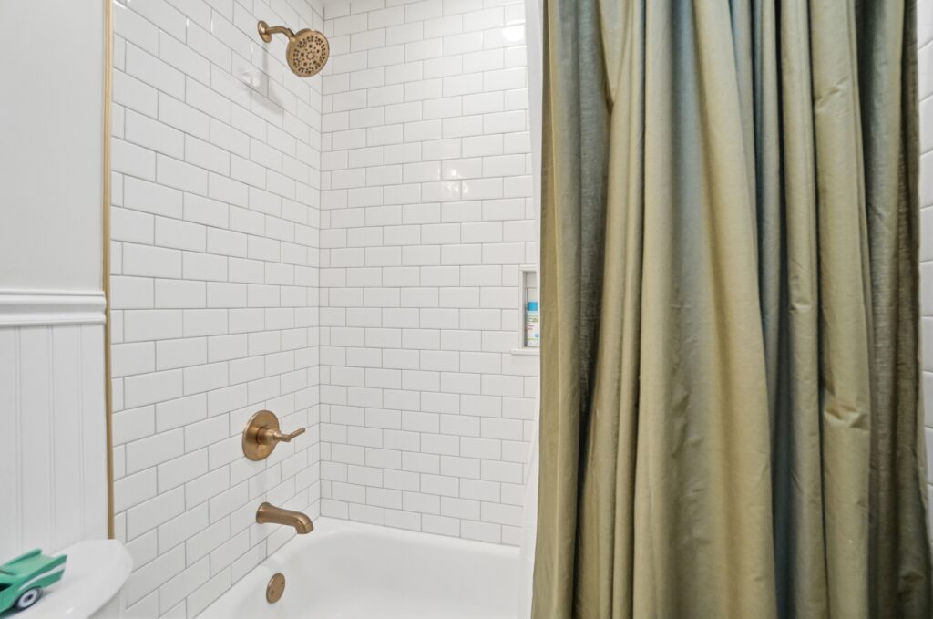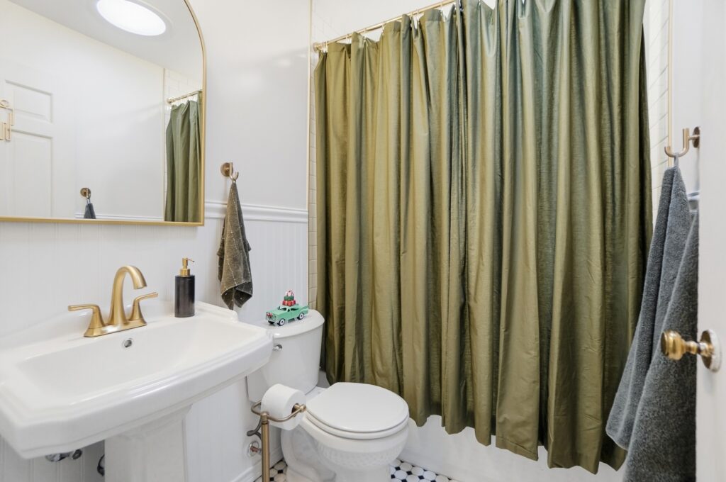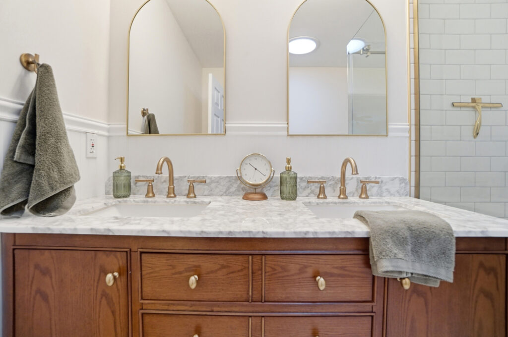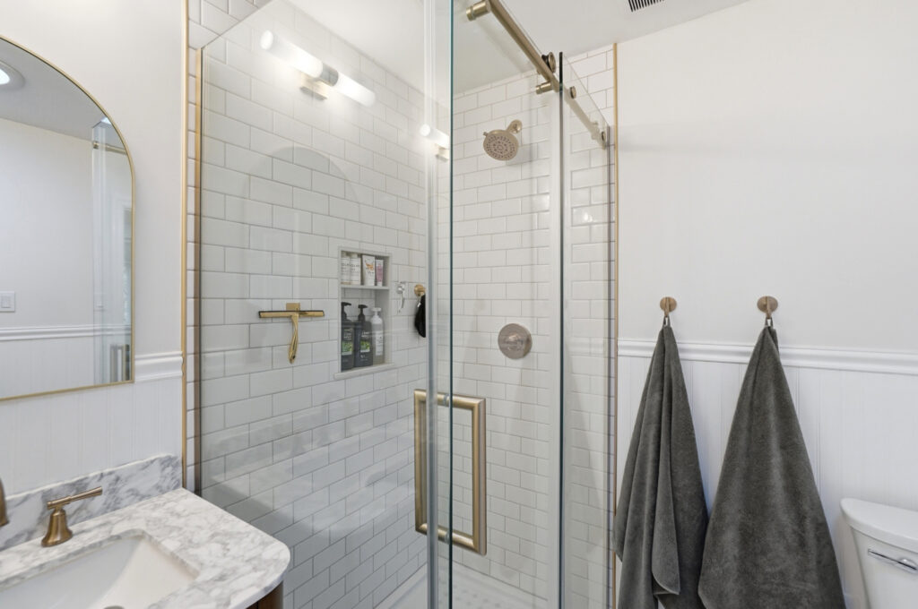 This bathroom renovation in West Chester Township blends modern design with thoughtful, personal details. Gold accents paired with classic black-and-white tile create a space that feels clean, timeless, and full of personality, proving that even small updates can make a big impact.